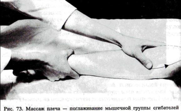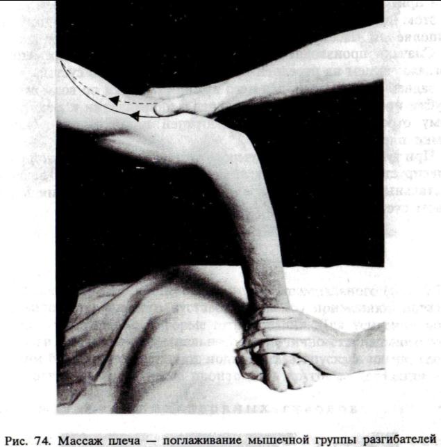 При массировании мышц-разгибателей массирующая рука захватывает трёхглавую мышцу большим и четырьмя остальными пальцами, большой палец начинает своё движение у лучевой стороны локтевого отростка, скользит вдоль наружной борозды двуглавой мышцы, затем движется по заднему краю дельтовидной мышцы до подкрыльцовой впадины, остальные четыре пальца, начав своё движение вдоль внутренней борозды двуглавой мышцы, также продвигаются по внутреннему краю дельтовидной мышцы (рис. 74). У акромиального отростка большой и остальные четыре пальца сходятся. Из других массажных приёмов применяют полукружное растирание, а также продольное и поперечное разминание в восходящем и нисходящем направлении. Эти последние два массажных приёма комбинируются с обхватывающим непрерывистым поглаживанием.