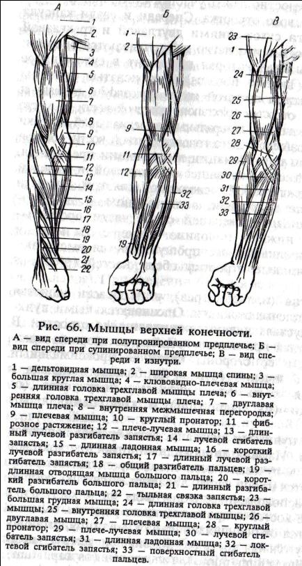Плечо: При осмотре его спереди отчётливо заметна контурирующаяся двуглавая мышца плеча (m. Biceps), по обе стороны которой хорошо выделяются две бороздки. По наружной борозде снизу вверх направляется лучевая вена (v, cephalica), по внутренней- локтевая вена (v. Basilica), которую сопровождает внутренний кожный нерв (N. Cutaneus medialis). Анастомоз вен образует как бы букву М, которая, просвечивая, нередко хорошо видна в глубине подкожной клетчатки локтевой ямки предплечья.