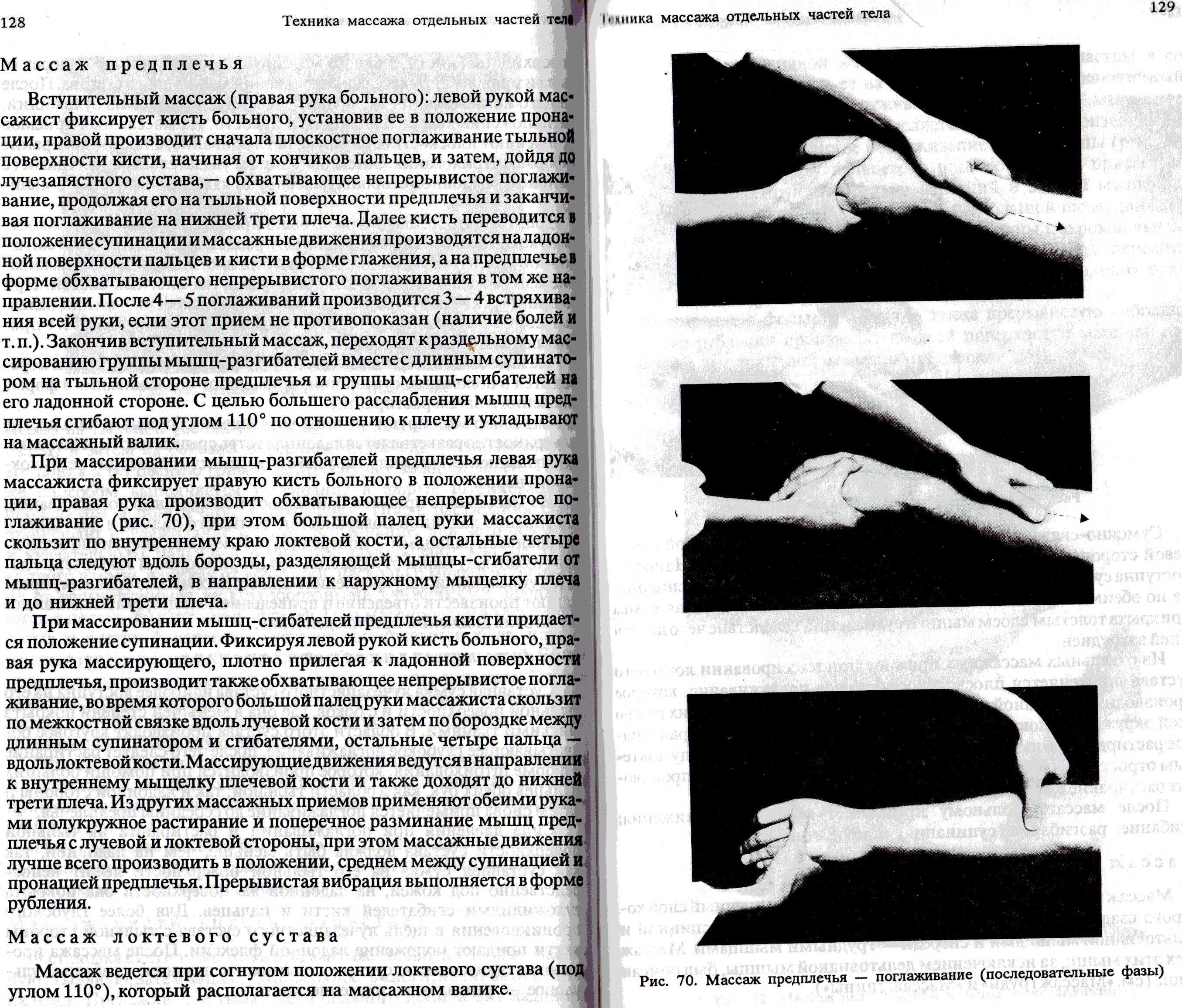 При массировании мышц-сгибателей предплечья кисти придаётся положение супинации. Фиксируя левой рукой кисть больного, правая рука массирующего, плотно прилегая к ладонной поверхности предплечья, производит также обхватывающее непрерывистое поглаживание, во время которого большой палец руки массажиста скользит по межкостной связке вдоль лучевой кости и затем по бороздке между длинным супинатором и сгибателями, остальные четыре- вдоль локтевой кости. Массирующие движения ведутся в направлении к внутреннему надмыщелку плечевой кости и также доходят до нижней трети плеча. Из других массажных приёмов применяют обеими руками полукружное растирание и поперечное разминание мышц предплечья с лучевой и локтевой стороны, при этом массажные движения лучше всего производить в положении, среднем между супинацией и пронацией предплечья. Прерывистая вибрация выполняется в форме рубления.