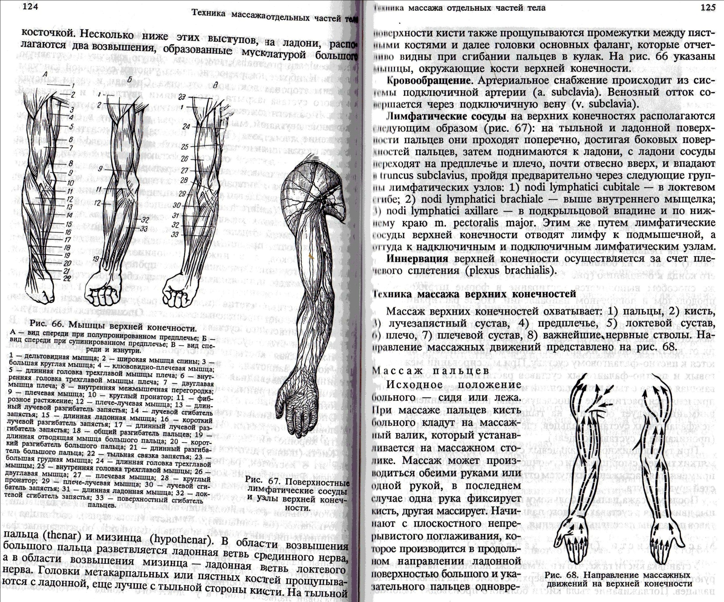 Методические указания: Массажу отдельных сегментов должен предшествовать подготовительный массаж всей верхней конечности. Учитывая, что большинство мышц предплечья, окружающих со всех сторон лучевую и локтевую кости своими длинными сухожилиями оканчивается на средних и ногтевых фалангах пальцев кисти, массаж предплечья должен всегда охватывать также и кисть, начиная от кончиков пальцев. Массировать только кисть или предплечье отдельно не следует. Ввиду того что ряд мышц, прикрепляющихся к плечу, располагается также в области груди и спины, массаж плеча должен во всех случаях охватывать и плечелопаточный пояс. При массировании двуглавой, а также трёхглавой мышцы не следует энергично массировать в области внутренней борозды двуглавой мышцы, так как в этом месте проходят крупные кровеносные сосуды (артерии и вены), а также лучевой нерв. При массировании нервов не следует энергично надавливать на них, чтобы не вызвать неприятных ощущений. Энергичное надавливание на лучевой нерв вызывает у больного появление ощущения мурашек на тыльной стороне кисти в области большого пальца. Интенсивное надавливание на локтевой нерв сопровождается чувством онемения и ощущением ползания мурашек в области мизинца. При массировании верхней конечности рекомендуется массажные движения комбинировать с гимнастическими упражнениями. Выбор и характер этих упражнений зависит от специальных указаний.