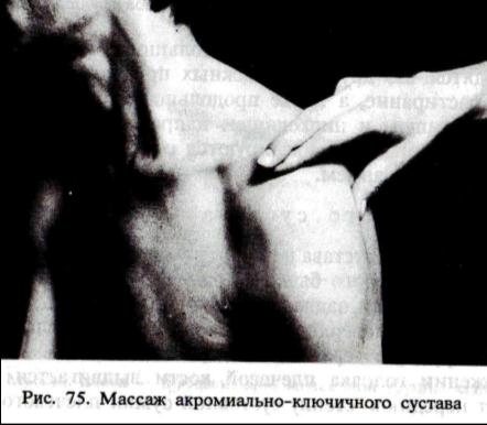 При вовлечении в процесс ключично-акромиального (рис. 75) и ключично-стернального суставов (рис. 76) применяют поглаживание и растирание в форме штрихования. Для усиления подвижности ключично-акромиального и ключично-стернального сочленений больному предлагают поднимать и опускать плечи, сводить и отводить их, а также производить круговые движения.