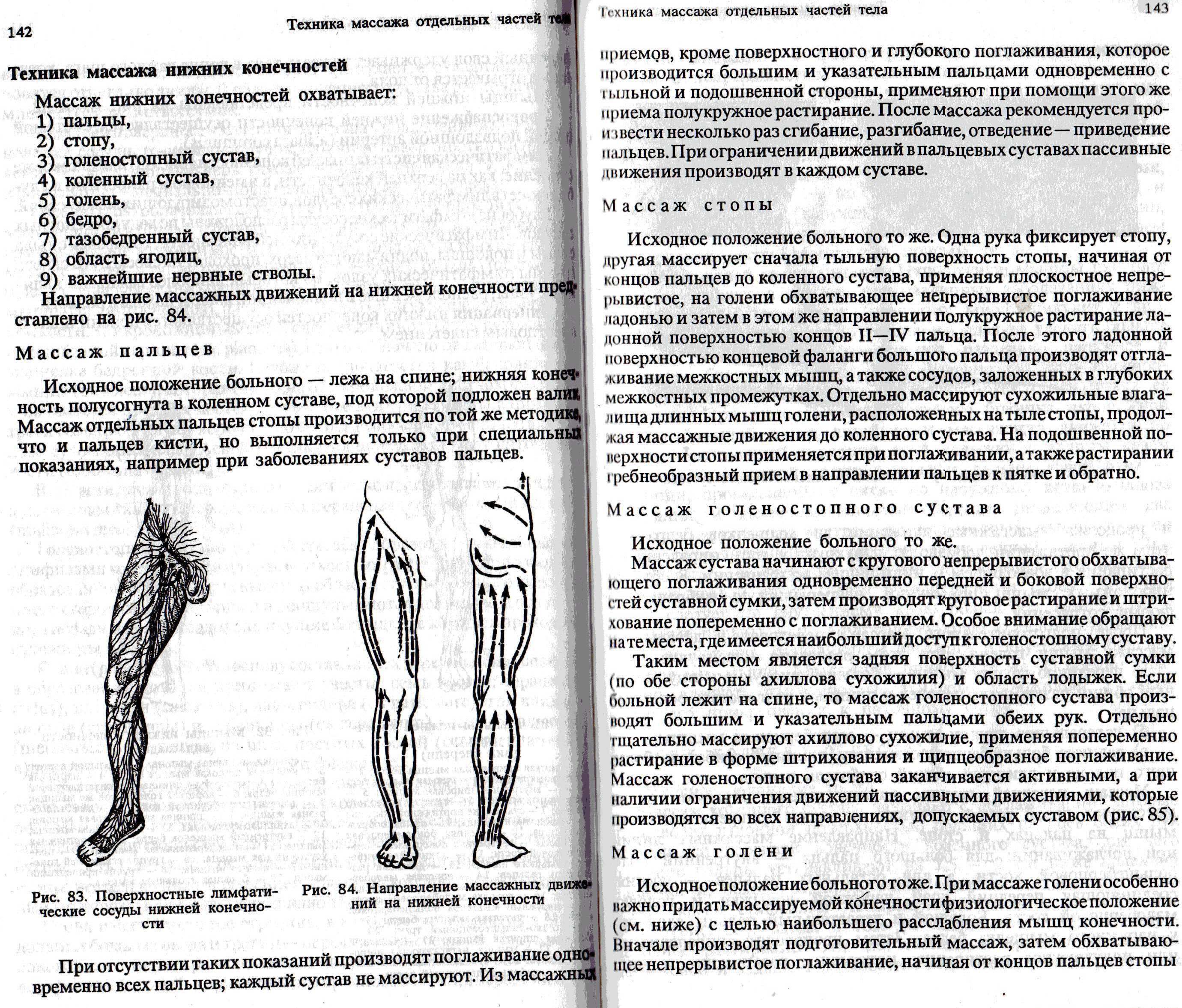 Методические указания: массажу отдельных сегментов должен предшествовать подготовительный массаж всей конечности. Ввиду того, что большинство мышц голени своими длинными сухожилиями оканчивается на плюсневых костях, а также на фалангах пальцев стопы, массаж мышц голени должен всегда охватывать и стопу, начиная от кончиков пальцев. Массировать только стопу или голень в отдельности не следует. Массаж мышц бедра должен охватывать и ягодичные мышцы. При массировании в области подколенной впадины массажные движения не должны быть энергичными, ввиду того что здесь расположены крупные сосуды, а также нервные стволы. На внутренней поверхности бедра, особенно в паховой области, не следует производить глубокое давящее поглаживание, а также прерывистую вибрацию в форме рубления ввиду прохождения здесь крупных кровеносных сосудов и нервов. Кроме того, внутренняя поверхность бёдер, а также область ягодиц являются местом восприятия половых раздражений, поэтому массирующие движения, особенно поверхностное поглаживание и растирание, не должны быть длительными. При массировании нижних конечностей рекомендуется массажные движения комбинировать с физическими упражнениями, выбор и характер которых определяется специальными показаниями.