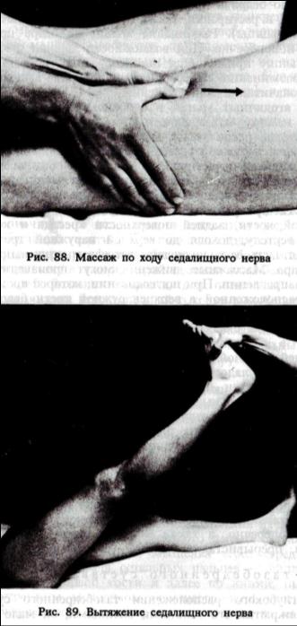Массаж важнейших нервных стволов: седалищный нерв наиболее доступен массированию на участке от линии нижнего края седалищного бугра до середины подколенной впадины. На этом протяжении применяют плоскостное непрерывистое глубокое поглаживание большими пальцами обеих рук (рис. 88), растирание обоими большими пальцами, двигающимися один за другим и описывающими полукруги во взаимно противоположных направлениях и, наконец, непрерывистую и прерывистую вибрацию (пунктирование), которая также производится концом большого пальца. Сила давления при вибрации увеличивается постепенно по направлению к седалищному бугру, так как по мере удаления от коленного сустава седалищный нерв всё больше и больше прикрывается утолщающимся слоем мышц. После массажа при наличии показаний производится вытяжение нерва, для чего больному предлагают поднять кверху ногу, разогнутую в коленном суставе, стопа должна находиться в положении по возможности максимального тыльного сгибания (рис. 89). При вовлечении седалищного нерва в процесс боли возникают по задней поверхности бедра. Бедренный нерв достижим на участке в области бедренного треугольника. При массировании его применяется лёгкое поглаживание и растирание, причём следует избегать сильного давления. Для вытяжения бедренного нерва (при наличии показания) больного укладывают на живот и сгибают голень в коленном суставе, пригибая её к задней поверхности бедра. При вовлечении бедренного нерва в процесс возникают боли по передней поверхности бедра. Малоберцовый нерв массируют у головки малоберцовой кости (рис. 90). Массажные приёмы те же.