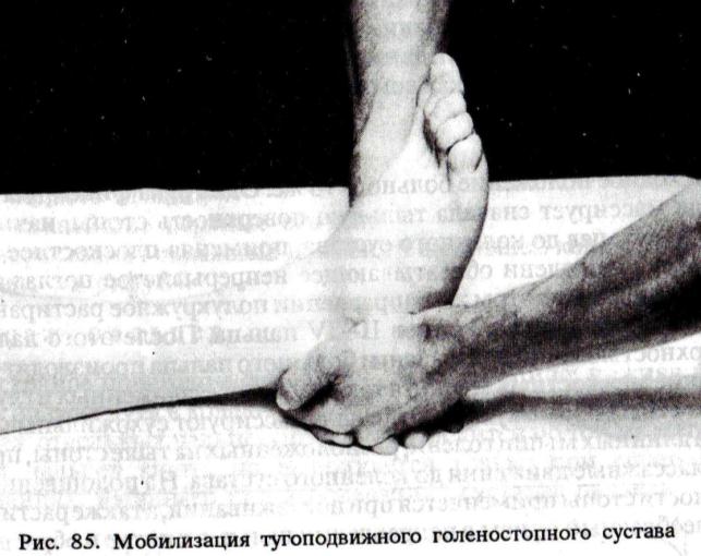 Массаж голеностопного сустава: Исходное положение больного то же. Массаж сустава начинают с кругового непрерывистого обхватывающего поглаживания одновременно передней и боковой поверхностей суставной сумки, затем производят круговое растирание и штрихование попеременно с поглаживанием. Особое внимание обращают нате места, где имеется наибольший доступ к голеностопному суставу. Таким местом является задняя поверхность суставной сумки (по обе стороны ахиллова сухожилия) и область лодыжек. Если больной лежит на спине, то массаж голеностопного сустава производят большим и указательным пальцами обеих рук. Отдельно Тщательно массируют ахиллово сухожилие, применяя попеременно растирание в форме штрихования и щипцеобразное поглаживание. Массаж голеностопного сустава заканчивается активными, а при наличии ограничения движений пассивными движениями, которые производятся во всех направлениях, допускаемых суставом (рис. 85).
