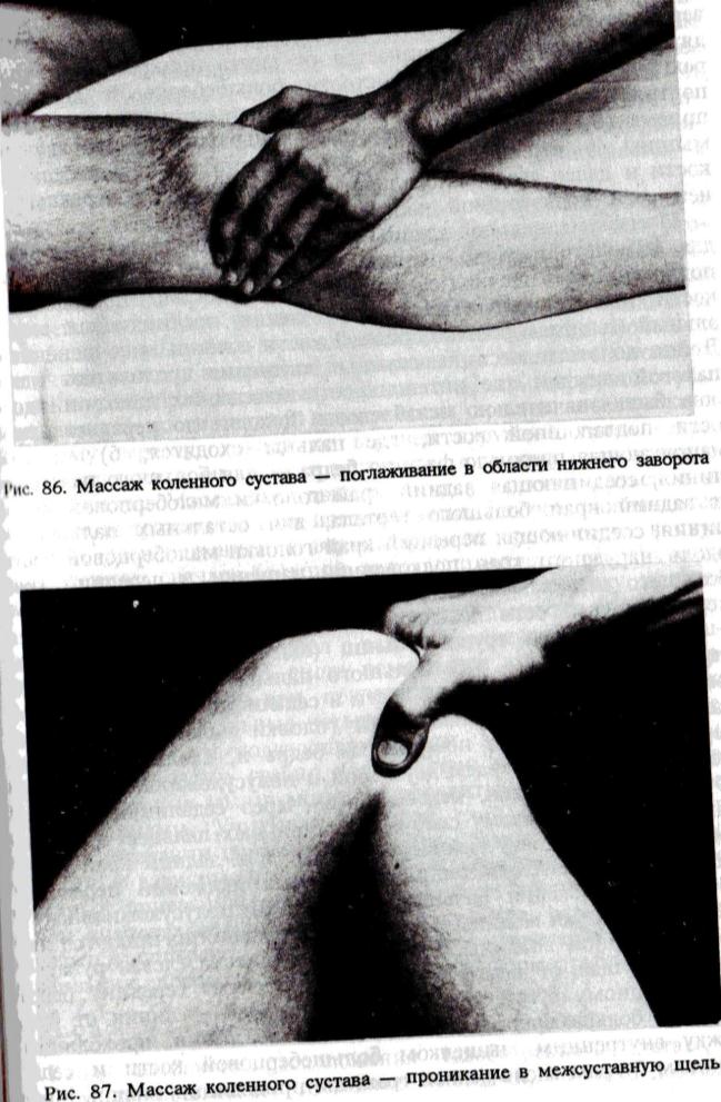 После массажа производят движения (на полную дугу) в коленном суставе- сгибание и разгибание, а также в пателлярно-бедренном суставе- сдвигание коленной чашечки вверх, вниз и в стороны.