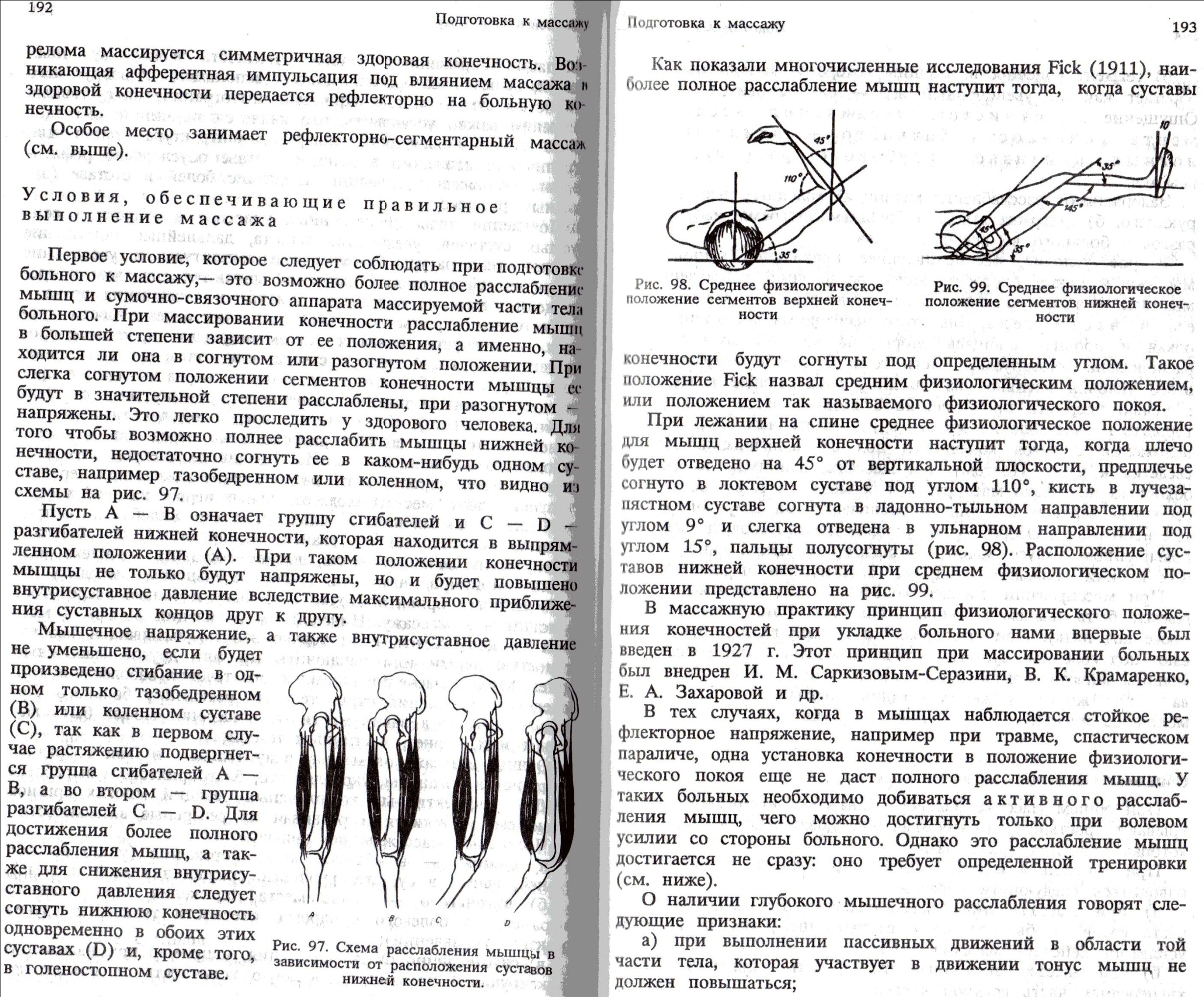 В массажную практику принцип физиологического положения конечностей при укладке больного нами впервые был введён в тысяча девятьсот двадцать седьмом году. Этот принцип при массировании больных был внедрён и. М. Саркизовым-серазини, в. К. Крамаренко, е. А. Захаровой и другими.