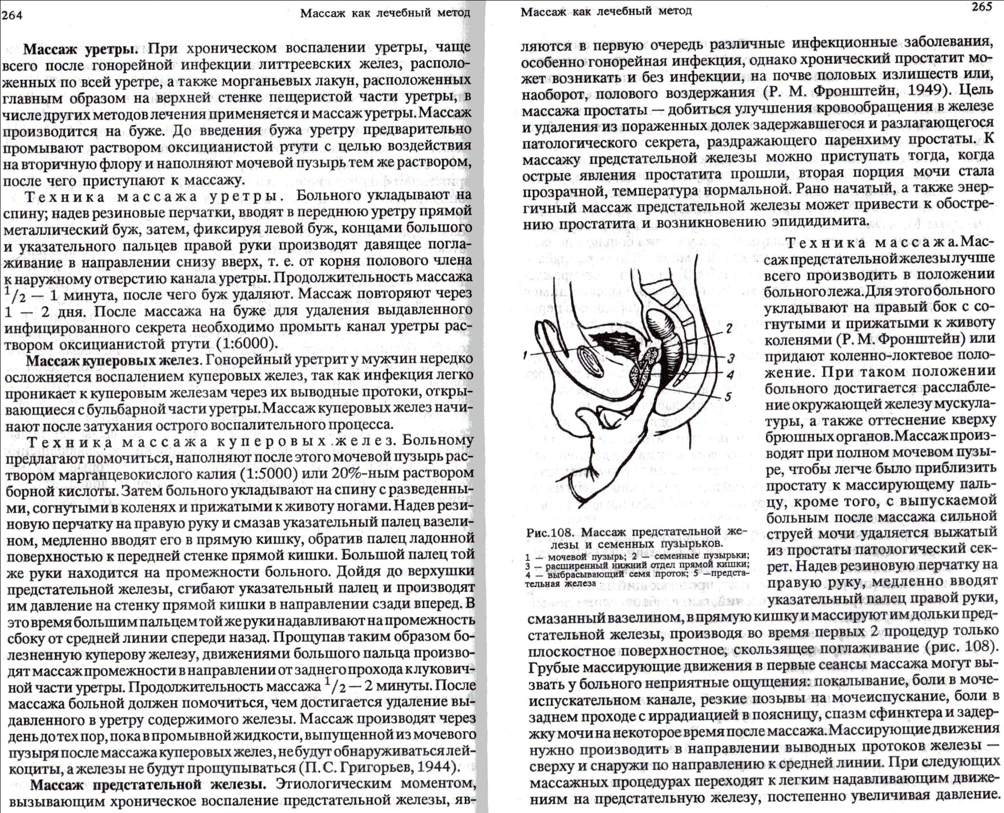 Массаж куперовых желёз: Гонорейный уретрит у мужчин нередко осложняется воспалением куперовых желёз, так как инфекция легко проникает к ним через выводные протоки, открывающиеся в бульбарной части уретры.Массаж куперовых желёз начинают после затухания острого воспалительного процесса. Больному предлагают помочиться, наполняют после этого мочевой пузырь раствором марганцевокислого калия (1 на 5000) или двадцатипроцентным раствором борной кислоты. Затем больного укладывают на спину с разведёнными согнутыми в коленях и прижатыми к животу ногами. Надев резиновую перчатку на правую руку и смазав указательный палец вазелином, медленно вводят его в прямую кишку, обратив палец ладонной поверхностью к передней её стенке, Большой палец той же руки находится на промежности больного. Дойдя до верхушки предстательной железы, сгибают указательный палец и производят им давление на стенку прямой кишки в направлении сзади вперёд. В это время большим пальцем тойже руки надавливают на промежность сбоку от средней линии спереди назад. Прощупав таким образом болезненную куперову железу, движениями большого пальца производят массаж промежности в направлении от заднего прохода к луковичной части уретры. Продолжительность массажа полторы-две минуты. После массажа больной должен помочиться, чем достигается удаление выдавленного в уретру содержимого железы. Массаж производят через день до тех пор, пока в промывной жидкости, выпущенной из мочевого пузыря после массажа куперовых желёз, не будут обнаруживаться лейкоциты, а железы не будут прощупываться (П. С. Григорьев, 1944).