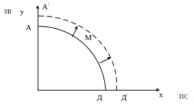Чи може суспільство вийти за межі своїх виробничих можливостей? Чи може зсунутися КВМ догори і праворуч? Безумовно, так. Або за рахунок технічних та економічних нововведень, або за рахунок збільшення виробничих ресурсів (відкриття нових природних копалин, включення у виробничу діяльність тих, хто раніше не працював і т.п.). Якщо нові технологічні процеси будуть впроваджуватися одночасно й рівномірно у всіх галузях, то зсув КВМ буде таким, як показано на графіку (рис. 2). Точка М, що знаходилась поза межами першої КВМ, стане тепер досяжною.