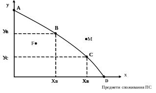 Точка М характеризує такий випуск продукції, який є недосяжним при повному використанні наявних ресурсів та існуючих технологій.