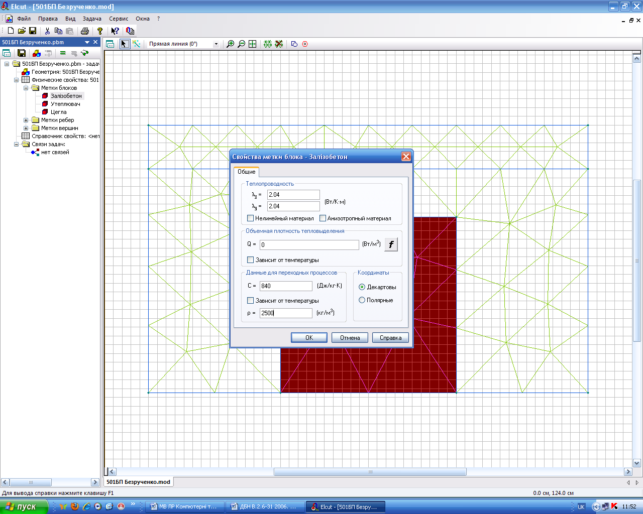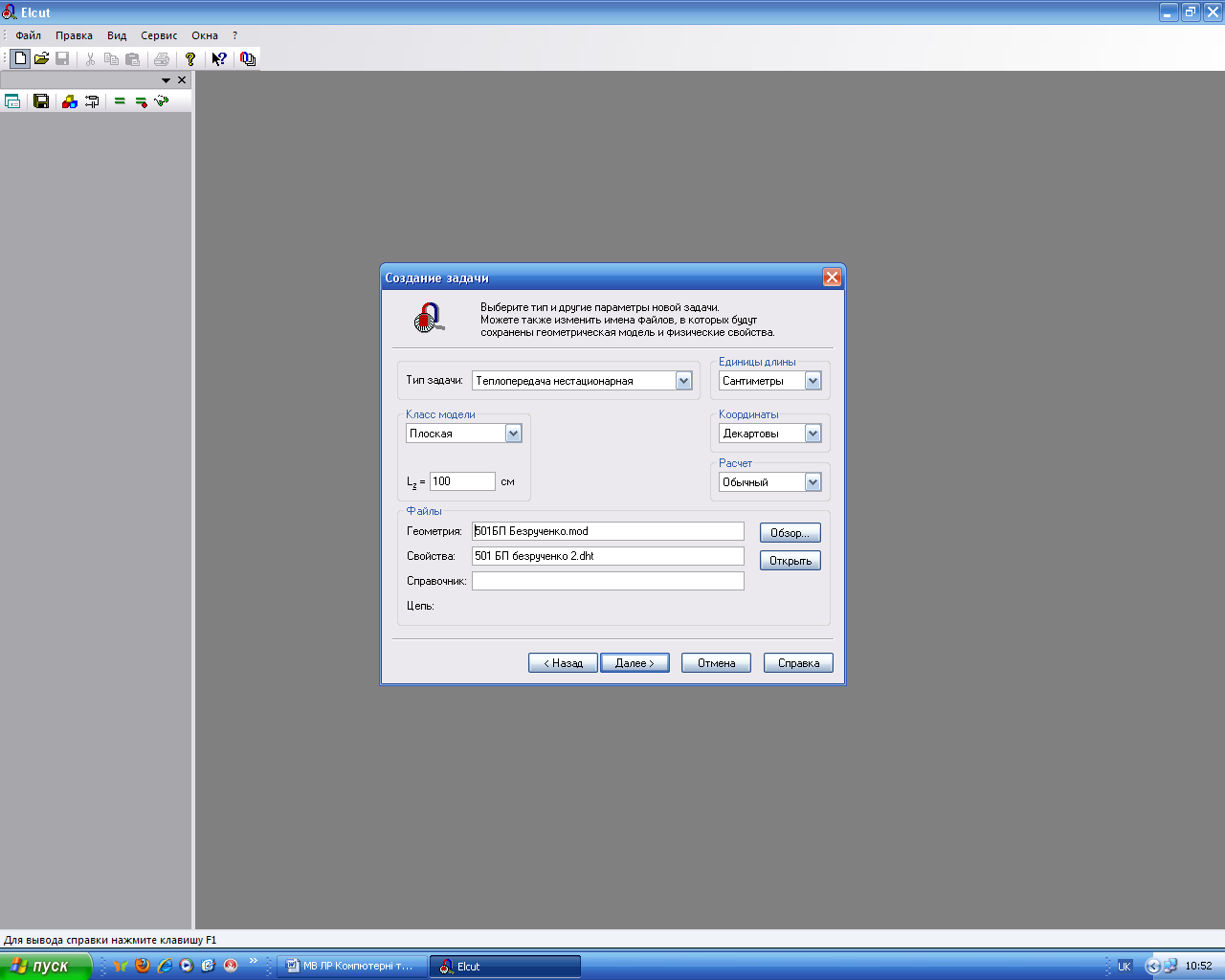 Створюємо нову задачу з назвою 501БП Безрученко 2, розташовуючи її в D:\ ELCUT \ 501БП\.