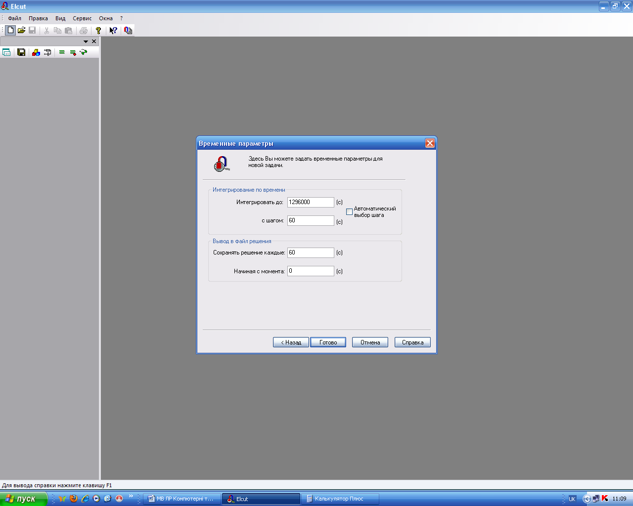 У вікні Временные параметры в полі Интегрировать до: вводимо 1296000 (кількість секунд у періоді в 15 діб). В полі с шагом: вводимо 60. Заповнення вікна Временные параметры наведено на рис. 36.