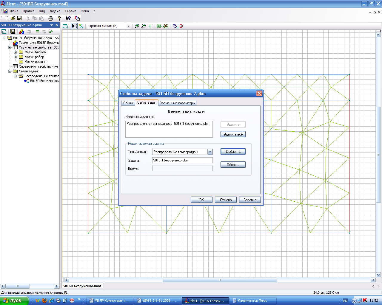 У вікні Свойства задачи - 501БП Безрученко 2.pbm відкриваємо вкладку Связь задач. У вікні Тип данных вибираємо Распределение температуры. Натискаємо кнопку Обзор та вибираємо файл 501БП Безрученко.pbm. Натискаємо кнопку Добавить та OK. Заповнення вкладки Связь задач вікна Свойства задачи - 501БП Безрученко 2.pbm наведено на рис. 39.