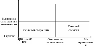 Чтобы уменьшить потенциально возможное сопротивление, нужно объединить людей в творческие группы, которые будут способствовать изменениям, поощрить широкую общественность сотрудников к выполнению программы изменений, провести розъяснительную работу относительно необходимости изменений (чтобы достичь целей организации). Руководителям, внедряя изменения, следует демонстрировать высокий уровень уверенности в необходимости изменений, пытаться быть последовательными в реализации программы изменений. Нужно помнить, что в ходе изменения позиция людей может изменяться (рис. 7.2).
