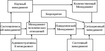 Рис.2.2 дает представление о содержании взаимосвязи между различными теории я мы. Из него, например, видно, что систематический менеджмент стал основою формирования научного, административного и человеческого менеджмента, из которого, в свою очередь, вышел поведенческий и, наконец, ситуационный менеджмент.