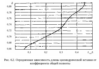 Наиболее очевидным и, вместе с тем, в максимальной степени влияющим на снижение трудоемкости изготовления корпусных конструкций является применение возможно более длинной цилиндрической вставки. С другой стороны, наличие цилиндрической вставки может оказывать влияние на ходкость судна. Однако, при соблюдении определенных условий (см. п. 2.2.4), сопротивления воды движению судна может не увеличиваться. Одним из основных условий этого является назначение оптимальной длины цилиндрической вставки, т.е. такой максимальной длины, при которой ходкость судна не ухудшается. Осредненная зависимость оптимальной относительной длины цилиндрической вставки LЦВ/L (где LЦВ – длина цилиндрической вставки, L – длина судна) от коэффициента общей полноты судна δ приведена на рис. 6.2.