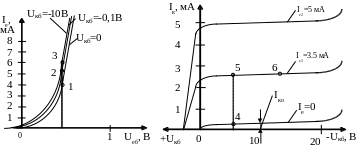 Сімейство вхідних характеристик для схеми СБ зображено на рис. 4а. Вхідна ВАХ при напрузі на колекторному переході, що дорівнює нулю, аналогічна до прямої вітки ВАХ діода.