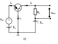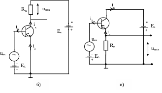 У цих схемах джерела постійної напруги і резистори забезпечують режими роботи транзисторів на постійному струмі, тобто необхідні значення початкових напруг і струмів. Вхідний змінний сигнал створюється джерелом uвх. Він змінює струм емітера транзистора, отже, і струм колектора. Прирости струму колектора (рис.3а, б) і струму емітера (рис.3в) відповідно на резисторах Rк і Rе створять прирости напруг, які є вихідними сигналами uвих. Параметри схем вибирають так, щоб uвих було набагато більшим за uвх (рис.3 а, б) або близьким до нього (рис.3 в).