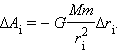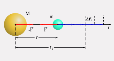 Полная работа при перемещении тела массой m из начального положения в бесконечность находится суммированием работ ΔAi на малых перемещениях: