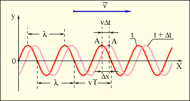 Рисунок 2.6.4. «Моментальные фотографии» бегущей синусоидальной волны в момент времени t и t + Δt. |