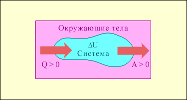 На рис. 3.9.1 условно изображены энергетические потоки между выделенной термодинамической системой и окружающими телами. Величина Q > 0, если тепловой поток направлен в сторону термодинамической системы. Величина A > 0, если система совершает положительную работу над окружающими телами.