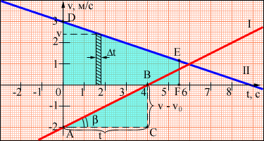 По наклону графика скорости может быть определено ускорение a тела. Соответствующие построения выполнены на рис. 1.4.2 для графика I. Ускорение численно равно отношению сторон треугольника АВС: