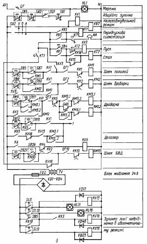 Схема автоматичного керування забезпечує роздільну роботу лінії подрібнення зерна та лінії завантаження. При необхідності обидві лінії в змозі працювати спільно. Схему силової мережі лінії подрібнення наведено на рис. 3, а.