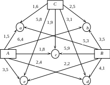 3. Транспортные расходы перевозки 1 тыс. бутылок указаны при соответствующих дугах. Каждый из заводов ежедневно производит следующее количество бутылок лимонада (в тыс.бут.): A = 90, B = 75, C = 70. Потребности складов (в тыс.бут.): a = 40, b = 35, c = 70, d = 40, e = 50.