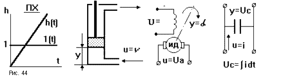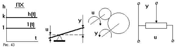 В ответ на единичное ступенчатое воздействие сигнал на выходе мгновенно достигает величины в k раз большей, чем на входе и сохраняет это значение (рис.43). При k = 1 звено никак себя не проявляет, а при k = - 1 - инвертирует входной сигнал.
