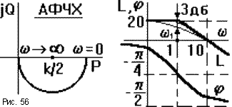 Если k 1, то передаточную функцию звена можно рассматривать как произведение W = k.W1, где W1 - передаточная функция с k = 1. При этом амплитуда вектора АФЧХ W(j ) при всех значениях должна быть увеличена в k раз, то есть A( ) = kA1( ). Поэтому, например, центр полуокружности АФЧХ апериодического звена будет находиться не в точке P = 1/2, а в точке k/2. ЛАЧХ также изменится: L( ) = 20lgA( ) = 20lgkA1( ) = 20lgk + 20lgA1( ). Поэтому при k 1 ЛАЧХ звена нужно поднять по оси ординат не меняя ее формы на 20lgk. На ЛФЧХ изменение k никак не отразится. Для примера на рис.56 приведены частотные характеристики апериодического звена при k = 10 и T = 1c. При этом ЛАЧХ апериодического звена с k = 1 поднята вверх на 20lg10 = 20.