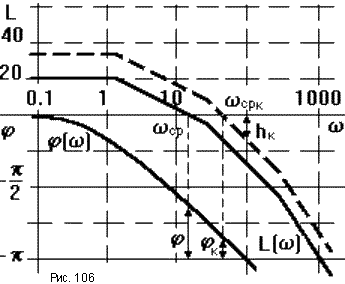 На рис.106 сплошными линиями показаны частотные характеристики исходной разомкнутой САУ при T1 = 0.5c, T2 = 0.02c, T3 = 0.002c, K = 10.