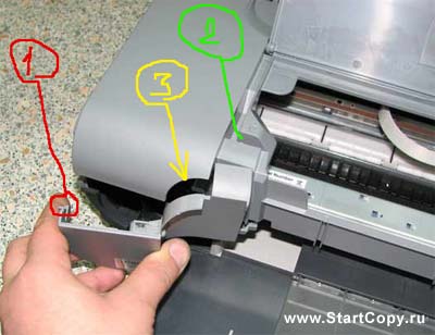 5. Звільніть засувки корпусу – по дві з кожного боку і три ззаду, зніміть корпус принтера. Знайдіть ломану вісь ролика подачі паперу, зніміть її. Щоб було зручніше знімати зламаних ролик для ремонту, зніміть "кронштейн", в який входила зламана вісь (рис. 10).