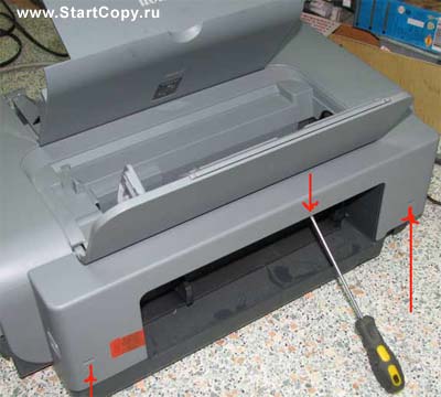 3. Далі зніміть передні накладки. Вони легше знімаються, коли звільнені засувки передній частині корпусу принтера (рис.8).