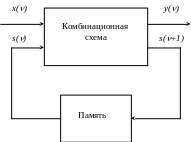 Кроме входных и выходных переменных, можно выделить некоторую совокупность промежуточных переменных, которые связаны с внутренней структурой автомата. В комбинационных схемах промежуточные переменные непосредственно не участвуют в соотношениях вход – выход. Напротив, выходные функции последовательностных схем в качестве своих аргументов, кроме входных переменных, обязательно содержат некоторую совокупность промежуточных переменных s1, s2, ..., sk, характеризующих состояние схемы. Набор всех возможных состояний, которые присущи данной схеме, называется множеством состояний. Если S1, S2, ..., Sk – конечные алфавиты переменных состояния s1, s2, ..., sk, то множество S = S1 S2 ... Sk также является конечным множеством.