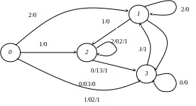 На рис. 2 показан граф, построенный в соответствии с приведенной общей таблицей переходов. Так как из состояния 0 автомат переходит в состояния 1, 2 и 3, то из вершины 0 графа исходят дуги в вершины 1, 2 и 3. При этом переход в состояние 1 совершается под воздействием 2 и ему соответствует выход 0, поэтому дуга из вершины 0 в 1 помечается как 2/0. Переход в состояние 2 совершается под воздействием 1 и ему соответствует выход 0, поэтому дуга из вершины 0 в 2 помечается как 1/0. Переходы в состояние 3 совершаются под воздействиями 0 и 3 и им обоим соответствует выход 0, поэтому дуга из вершины 0 в 3 помечается как дизъюнкция 0/0 3/0. Аналогично определяются и другие дуги графа. Петли соответствуют переходам, при которых состояния не изменяются. Так, рассматриваемый автомат переходит из состояния 2 в 2 под воздействиями 1 и 2, которым соответствуют выходы 0 и 1. Следовательно, петля при вершине 2 помечается как дизъюнкция 1/0 2/1.