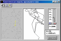 Нажмите кнопку «СТАРТ» во внутреннем окне экрана и проследите за хаотическим движением выделенной молекулы в замкнутом объеме слева во внутреннем окне экрана, вектор скорости которой изменяется при каждом упругом соударении с другими молекулами (их около 100) и со стенками сосуда. Данная молекулярная система является «механической» моделью идеального газа, находящегося при достаточно низком давлении. В правой части внутреннего окна происходит непрерывная регистрация ломаной линии – траектории движения выделенной молекулы состоящей из отдельных длин свободного пробега молекулы.