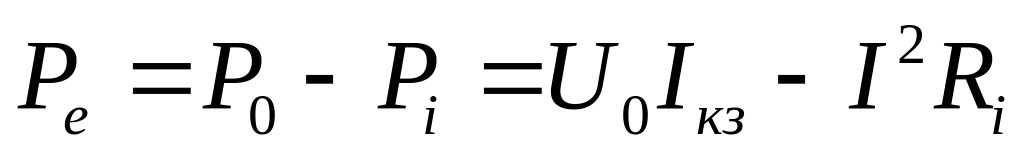 Потужність Ре дорівнює нулю коли струм І = Іхх = 0. Для визначення найбільшого значення потужності Ре візьмемо першу похідну від (10) та прирівняємо її до нуля, тобто Ре(І)=Uо-2∙Ri=0, звідки отримаємо співвідношення
