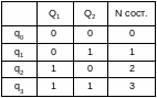 Число состояний автомата равно четырем и определяется самим заданием: РС содержит два элемента памяти – триггеры Т1,Т2, состояния которых Q1, Q2 и будут определять состояния автомата в целом Q={q0, q1, q2, q3}(см.табл. 1.5).