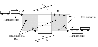 Схема движения поездов и автотранспорта через железнодорожный переезд, регулируемый шлагбаумом, приведена на рис.1.14.