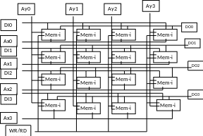 Конструктивно любое ОЗУ состоит из двух блоков — матрицы запоминающих элементов и дешифратора адреса. По технологическим соображениям матрица чаще имеет двухкоординатную дешифрацию адреса — по строкам и столбцам. На рис. 1 показана матрица 16-битного статического ОЗУ: она состоит из 16 ячеек памяти mem_i, схема которой приведена на рис. 2. Каждая ячейка памяти адресуется по входам X, Y путем выбора дешифраторами адресных линий по строкам Ах0...Ах3 и по столбцам Ау0...Ау3 (см. рис. 1) и подачи по выбранным линиям сигнала логической единицы. При этом в выбранной ячейке памяти срабатывает двухвходовой элемент И (U1), подготавливая цепи чтения-записи информации на входных DI0...DI3 или выходных DO0...DO3 разрядных шинах. Разрешающим сигналом для выдачи адреса является CS (chip select — выбор кристалла), который подается на вход разрешения счетчика адреса (Addr_cnt) или такой же вход дешифраторов, подключенных к выходам счетчика.