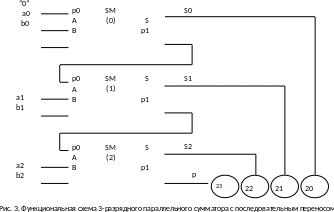 Суммирование многоразрядных двоичных чисел А=anan-1…a0 и B=bnbn-1…b0 производится путем их поразрядного сложения с переносом между разрядами. Поэтому основным узлом многоразрядных сумматоров является комбинационный одноразрядный сумматор, который выполняет арифметическое сложение трех одноразрядных чисел (цифр): цифры данного разряда первого слагаемого (ai), цифры данного разряда второго слагаемого (bi) и цифры (1 или 0) переноса из соседнего младшего разряда (pi). В результате сложения для каждого разряда получаются две цифры – сумма для этого разряда (Si) и перенос в следующий старший разряд (pi+1).