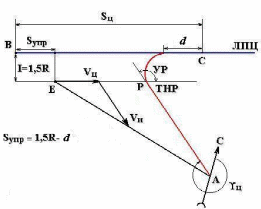 8. Паралельно ЛПЦ провести лінію на відстані від неї рівному інтервалові I=R(1-cosУР) і визначити точку початку розвороту.
