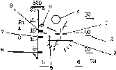 Рис. 2. Режим РЛС ("Захоплення"): 1-нерухливе перекрестие; 2-шкала тангажа; 3-лінія обрію; 4-прицелъное кільце; 5-мітка положення антени РЛПК; 6-мітка ДрМИН; 7-мітка Др МАКС2; 8-мітка Др МАКС1 ; 9-мітка поточної дальності до мети ДТЕК.