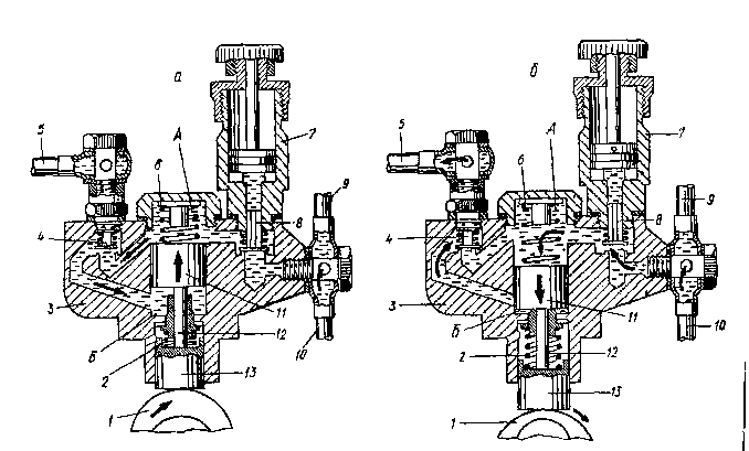 1–ексцентрик кулачкового вала паливного насоса високого тиску; 2–пружина штовхача; 3–корпус; 4–нагнітальний клапан; 5–трубка відведення палива до фільтра тонкого очищення; 6–пружина поршня; 7–насос ручного підкачування; 8–впускний клапан; 9–трубка відведення надлишку палива від паливного насоса високого тиску; 10–трубка підведення палива; 11–поршень; 12–шток; 13–штовхач; А –надпоршнева порожнина; Б –підпоршнева порожнина; а –підготовчий хід; б –робочий хід