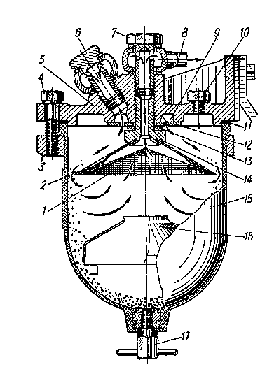 1–сітка; 2–напрямний конус; 3–кільце; 4–болт; 5–корпус; 6 і 7 –штуцерні болти; 8–паливопровід; 9–кільцева порожнина; 10–пробка; 11–прокладка; 12–розподільна шайба; 13–пружинна шайба; 14–втулка з шестигранною головкою; 15–стакан; 16–заспокоювач; 17–зливна пробка