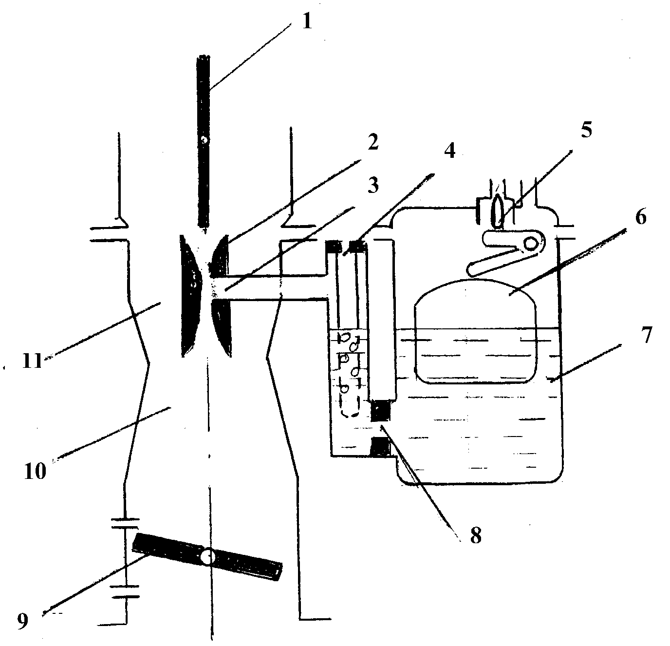 1–повітряна заслінка; 2–малий дифузор; 3–розпилювач; 4–повіт-ряний жиклер; 5–голковий клапан; 6–поплавок; 7–поплавкова камера; 8–паливний жиклер; 9–дросельна заслінка; 10–змішувальна камера; 11–великий дифузор.