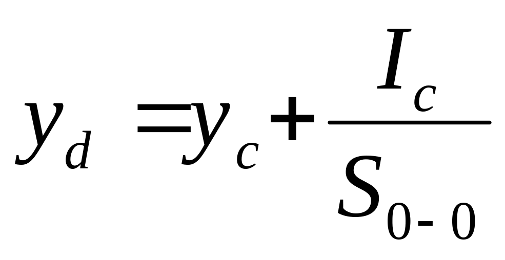 Положення центру тиску для стінок, що володіють вертикальною віссю симетрії, при обліку тільки надмірного тиску знаходиться за допомогою теореми про рівність моменту рівнодіючій сумі моментів складових. В цьому випадку центр тиску розташовується на осі симетрії, і положення його визначається координатою центру тиску yс, відлічуваної в площині стінки до лінії урізання, див. рис. 1.10: