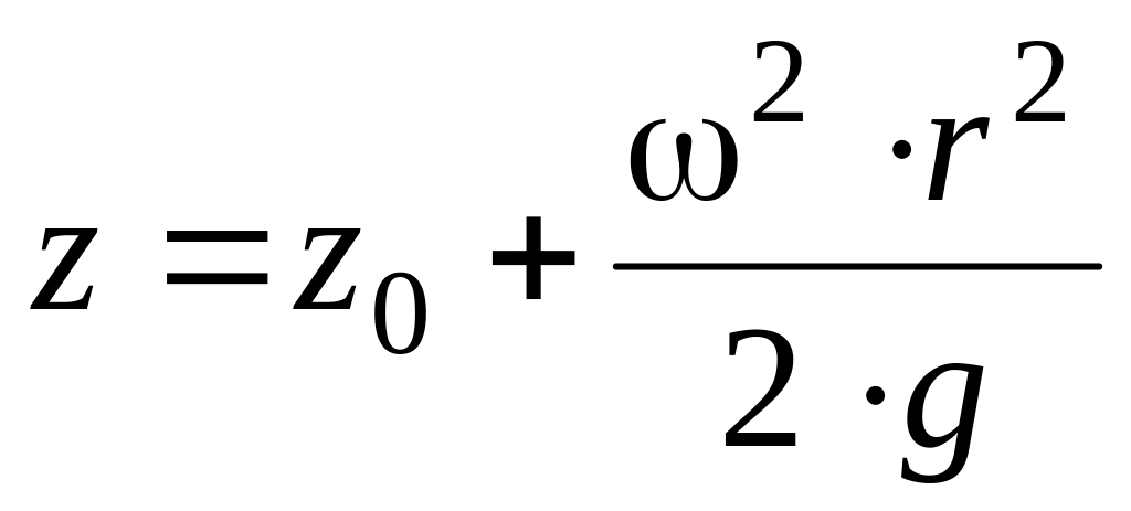 Поява сили . викликає зміну форми вільній поверхні, яка приймає форму параболоїда обертання, і з урахуванням дії сил тяжіння і відцентрової сили, після нескладних перетворень можна отримати рівняння поверхні рівного тиску: