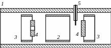 Базовая схема электродов разряда представлена на рис. 4. Система электродов крепится внутри кварцевого цилиндра (1) с внутренним диаметром 40 мм и длиной 160 мм. Анод газоразрядной системы (2) изготовлен из нержавеющей стали и представляет собой цилиндр диаметром 37 мм и длиной 30 мм. Плоские отражательные электроды (4) диаметром 20 мм и толщиной 5 мм изготовлены из меди и крепятся внутри цилиндров из нержавеющей стали (3).