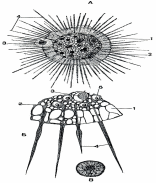 Среди солнечников, как пресноводных, так и морских, имеются некоторые виды с минеральным скелетом из кремнезема, подобно радиоляриям. Примером может служить пресноводная Clathrulina elegans (рис. 39). Это небольшой солнечник с типичными радиальными аксоподиями, тело которого окружено тонким скелетом в форме ажурного шарика. При помощи тонкой ножки организм этот прикрепляется к субстрату. В эндоплазме имеется одно ядро. При размножении Clathrulina протоплазма делится внутри скелета на две дочерние особи, которые выходят наружу через отверстие в скелете, а затем образуют свой новый скелет и стебелек.