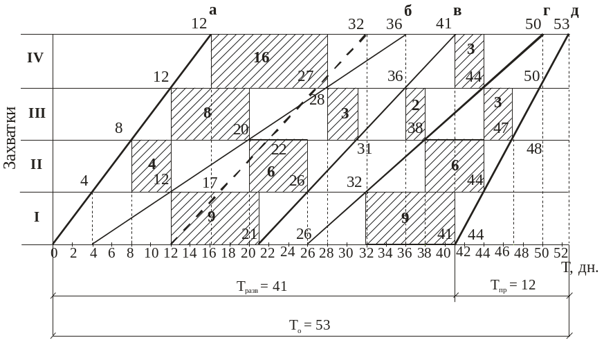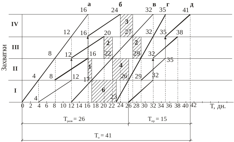 В первом случае, когда потоки расходящиеся (потоки а и б, в и г. рисунок 3), циклограмма следующего потока строится снизу, с первой захватки, с соблюдением правила начала последующей работы, т.е. начинается после окончания работы на первой захватке.